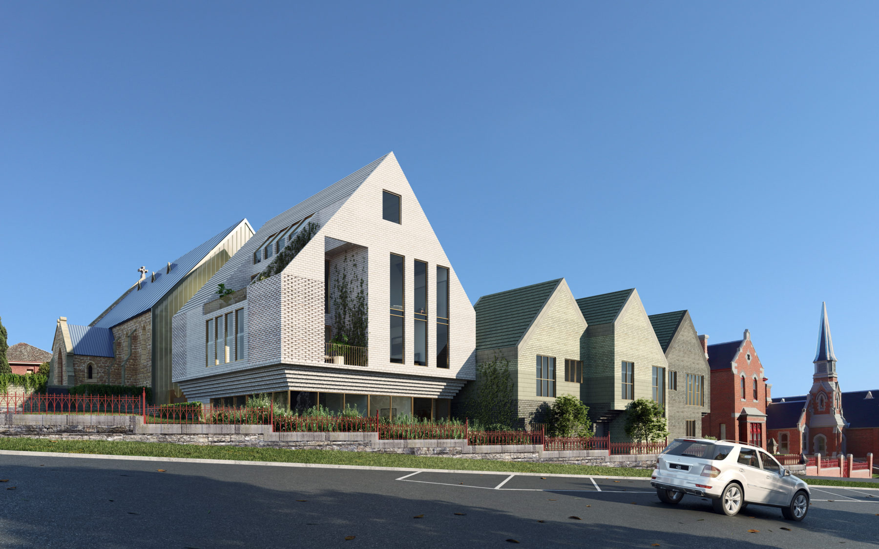 Located in a growing regional centre undergoing a shift toward increased urban density, Forest is a residential precinct that responds thoughtfully to its historic and emerging context. Framed by the heritage-listed All Saints Church and neighbouring boom-style architecture, the development occupies approximately one acre and offers a diverse mix of residential typologies arranged around a central courtyard. A shared open space acts as the heart of the precinct—fostering connection among residents while contributing to the public realm. The buildings are scaled and detailed to address their civic setting, operating both as homes and as a generous urban gesture that encourages community interaction and supports the evolving character of the regional centre.